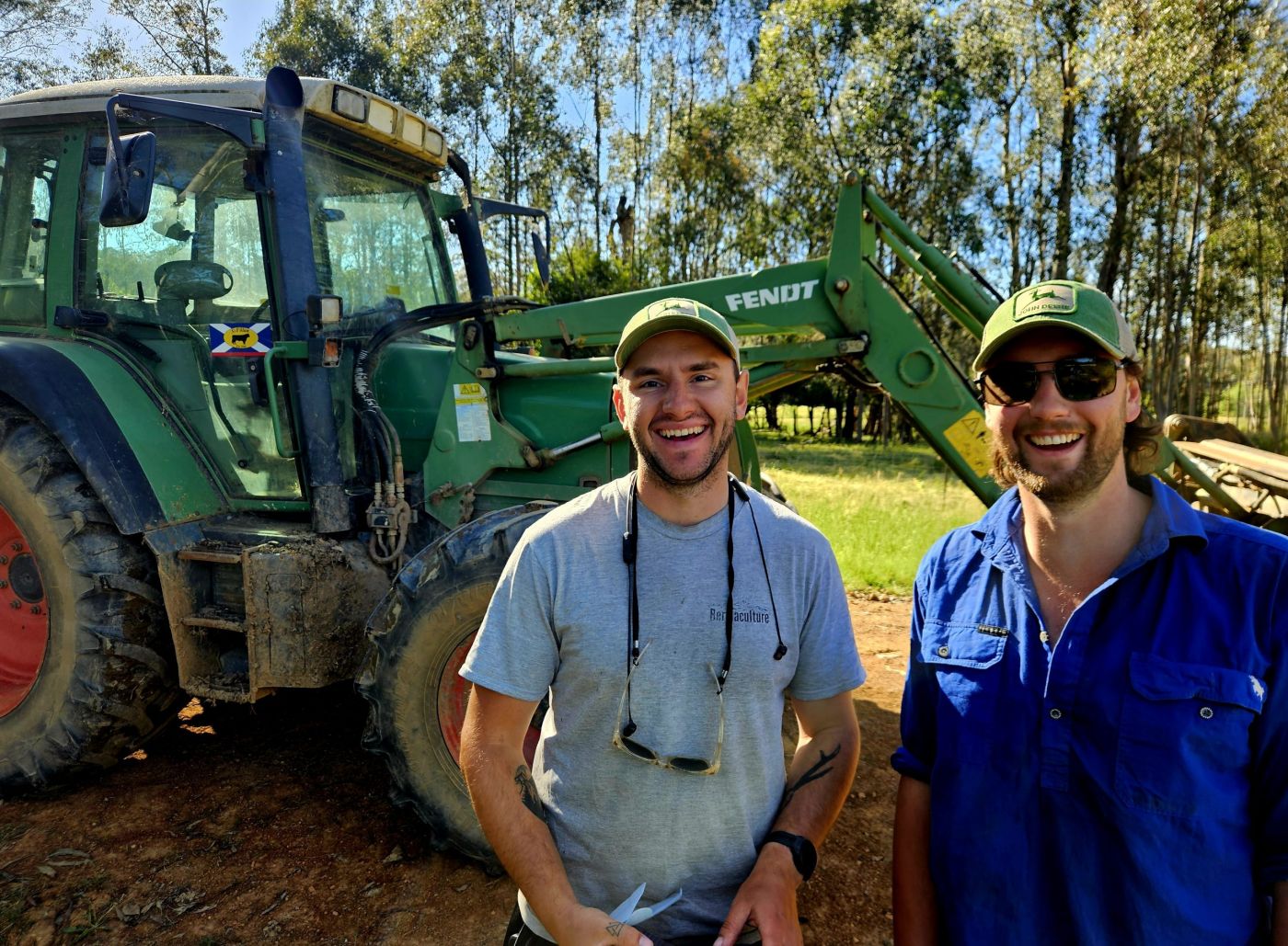 It’s all smiles at work on the farm this morning with Jayden Saggin and Brenden te Boekhorst as they enjoy getting about their day