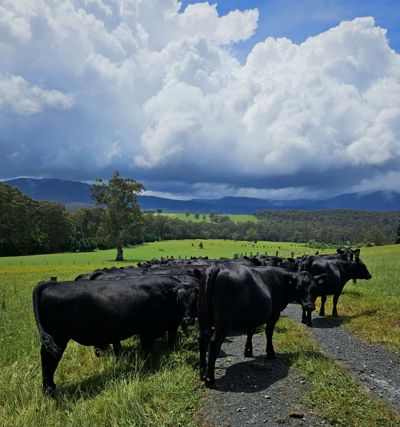 45mm in the gauge from this front as classic Spring weather includes thunderstorms, sunshine, humidity and deep thick grass. Here an aptly named yearling bull ‘St.Fillan RAINFALL’ gets his first action over a selected mob of our “U” heifers with the magnificent backdrop of dark cumulonimbus clouds and mountain ranges.
