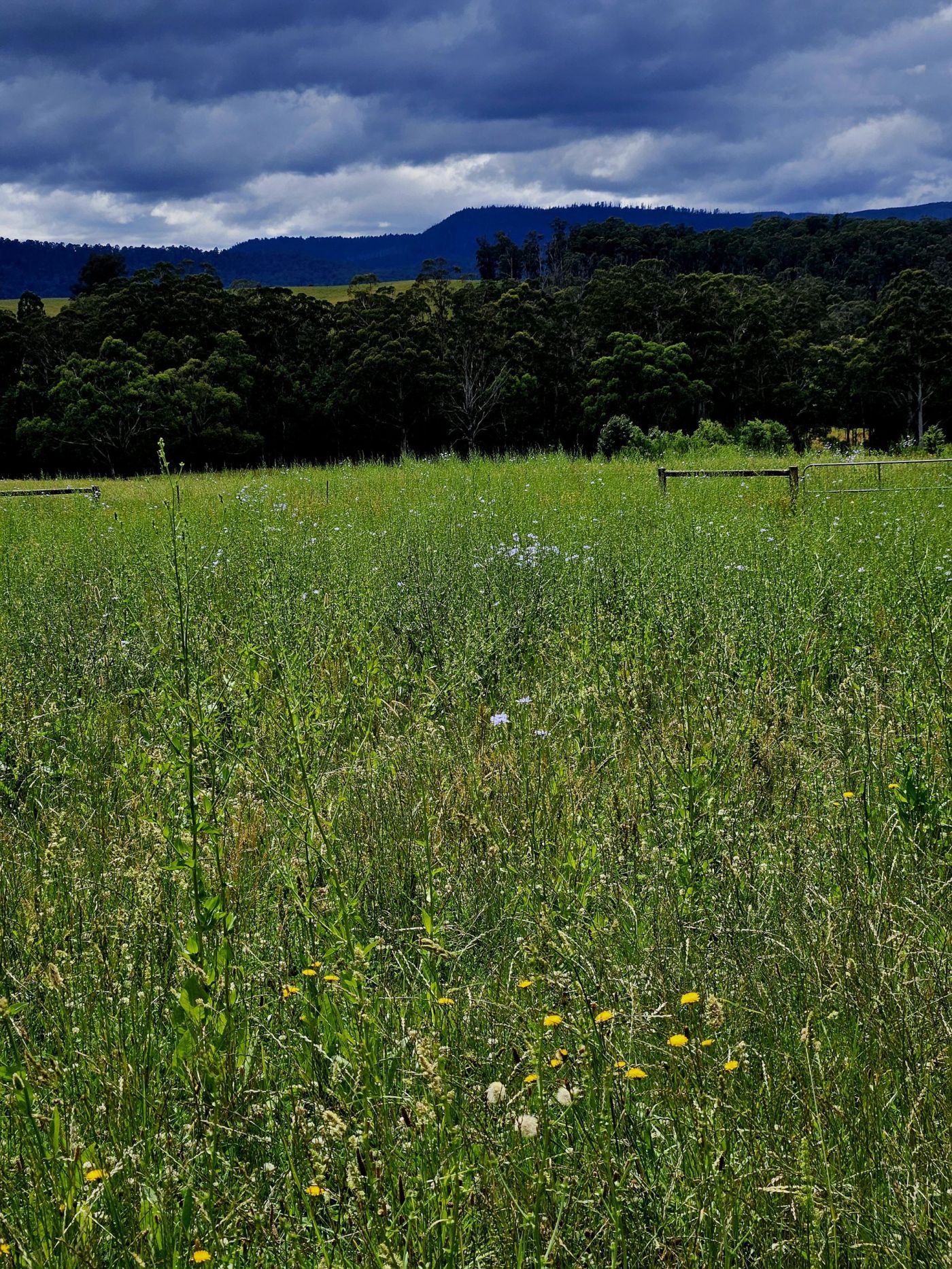 For those into farm carbon sequestration, diversity in pasture mixes, variation of root depths, bees and insects, regenerative agriculture and soil microbiology…this is one of St.Fillan Farms replanted meadows awaiting grazing. For those that aren’t, its a cool picture looking NE to the Great Dividing Range and Cathedral with a moody Summer sky.